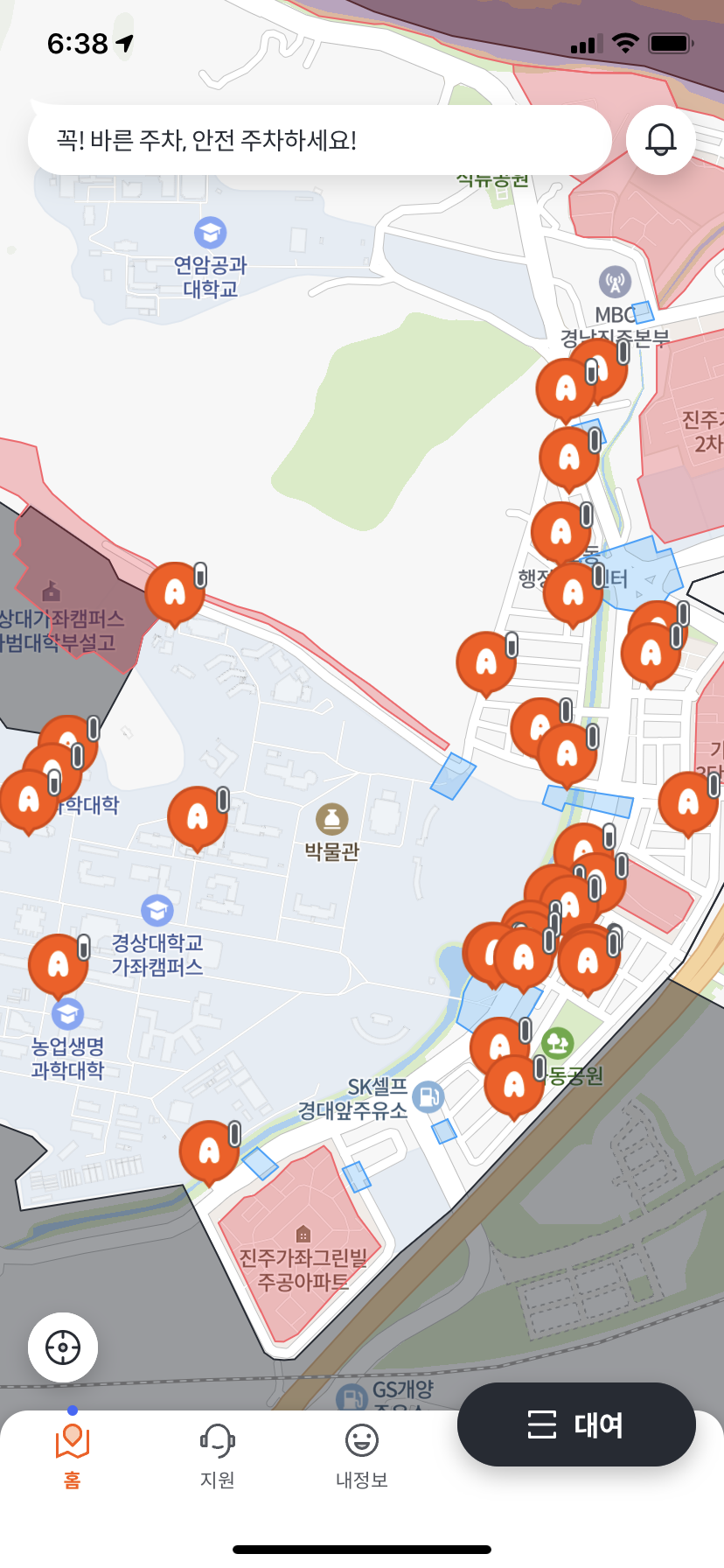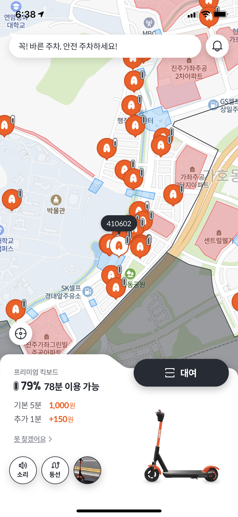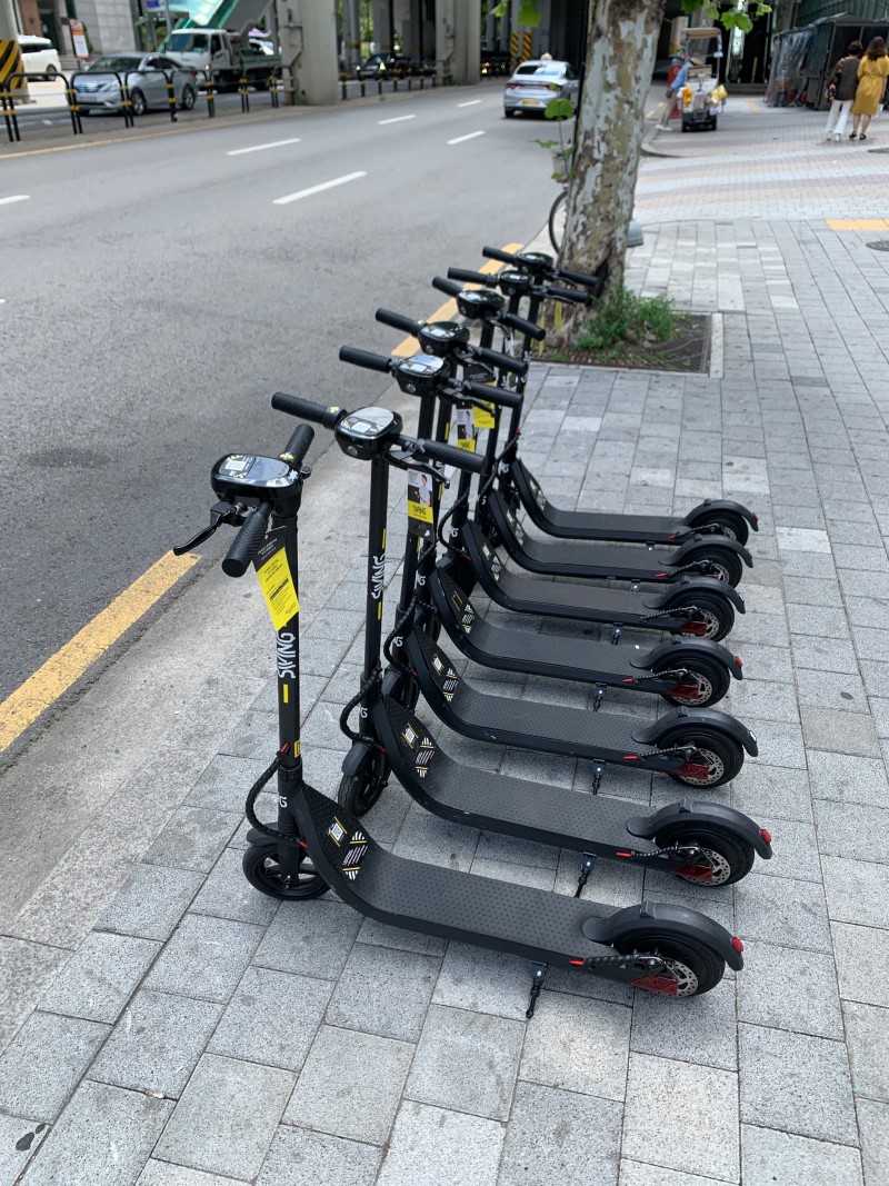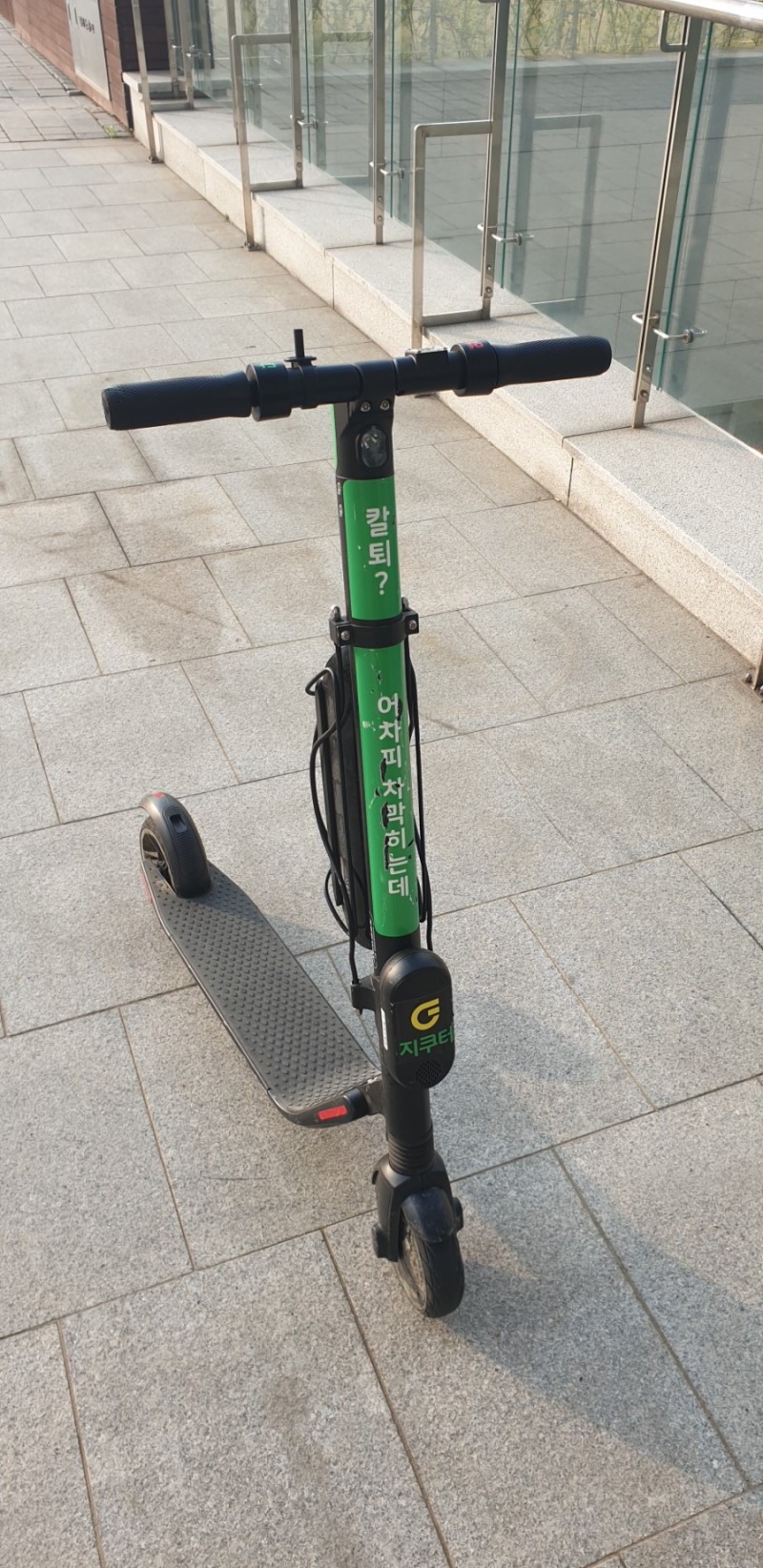 보통 이렇게 생겼습니다. 제 기억으로는 진주에 처음으로 도입된 공유킥보드 회사이고요.